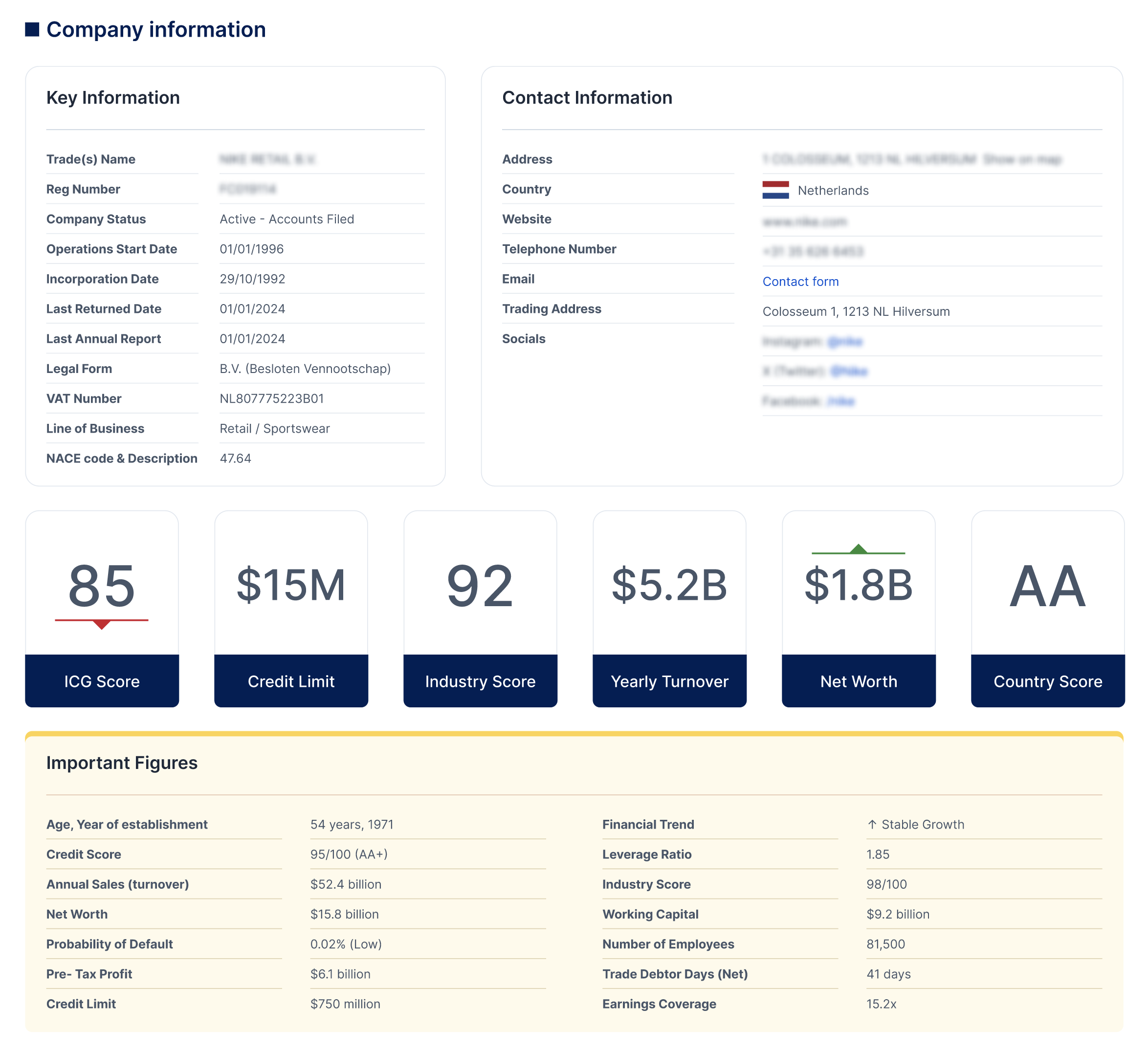 - Registration & VAT numbers; legal type; status
